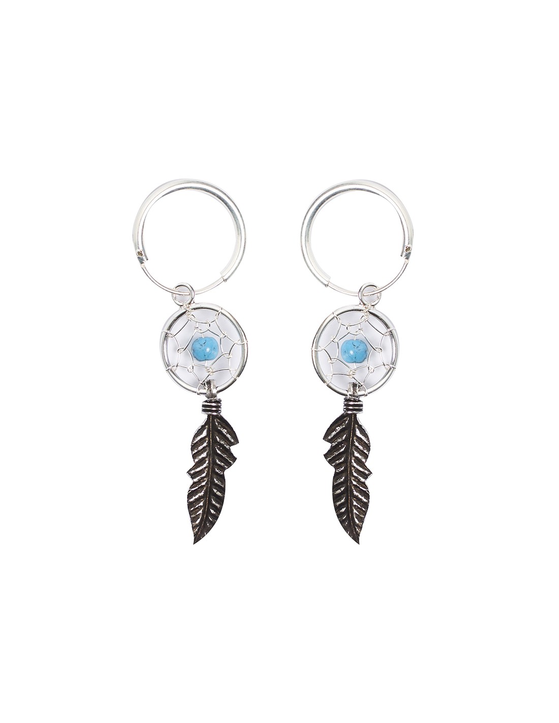 Aro de plata lisa de 1,2x12mm. con atrapasueños de 8 mm. y pluma . Con bolita central de Turquesa .