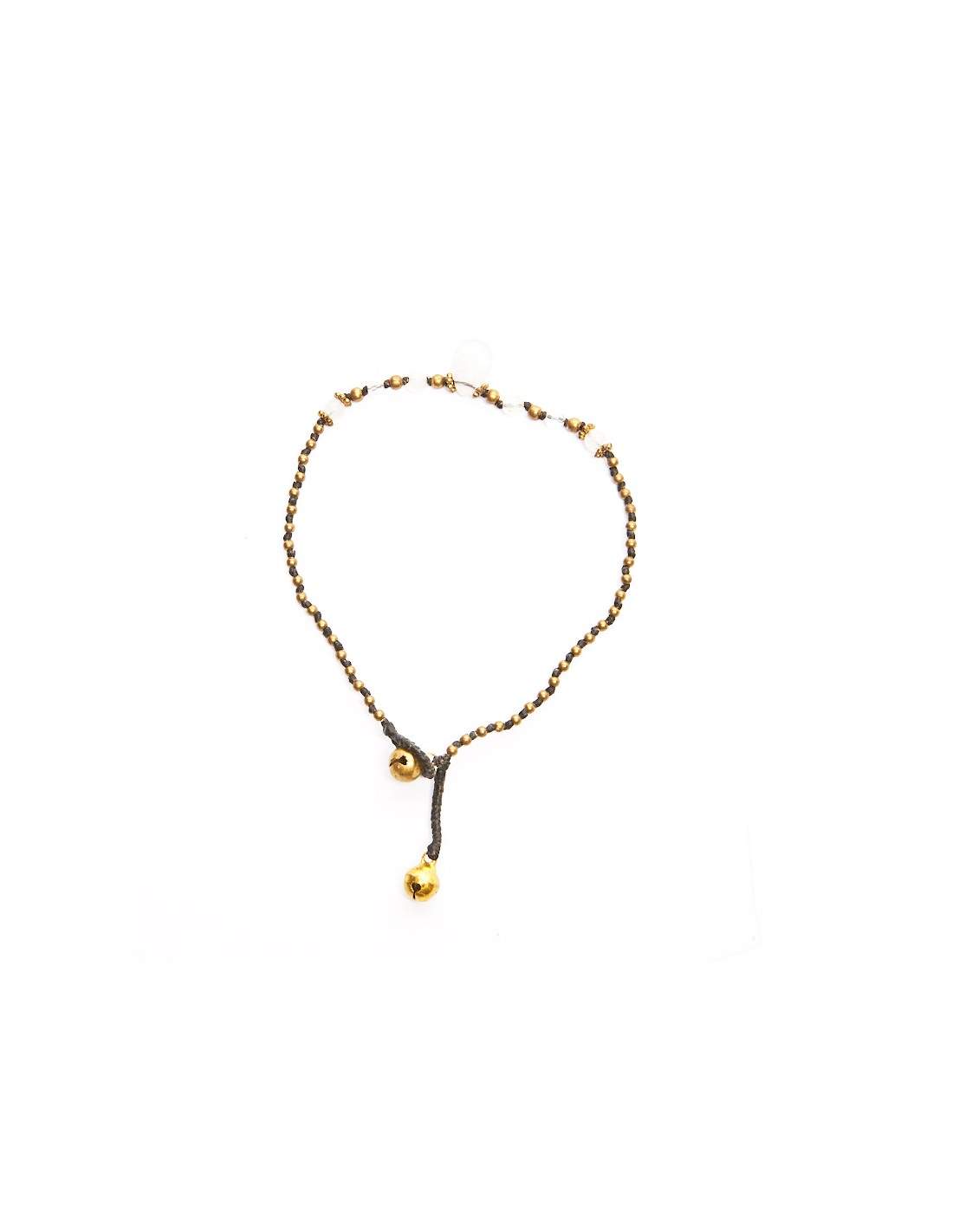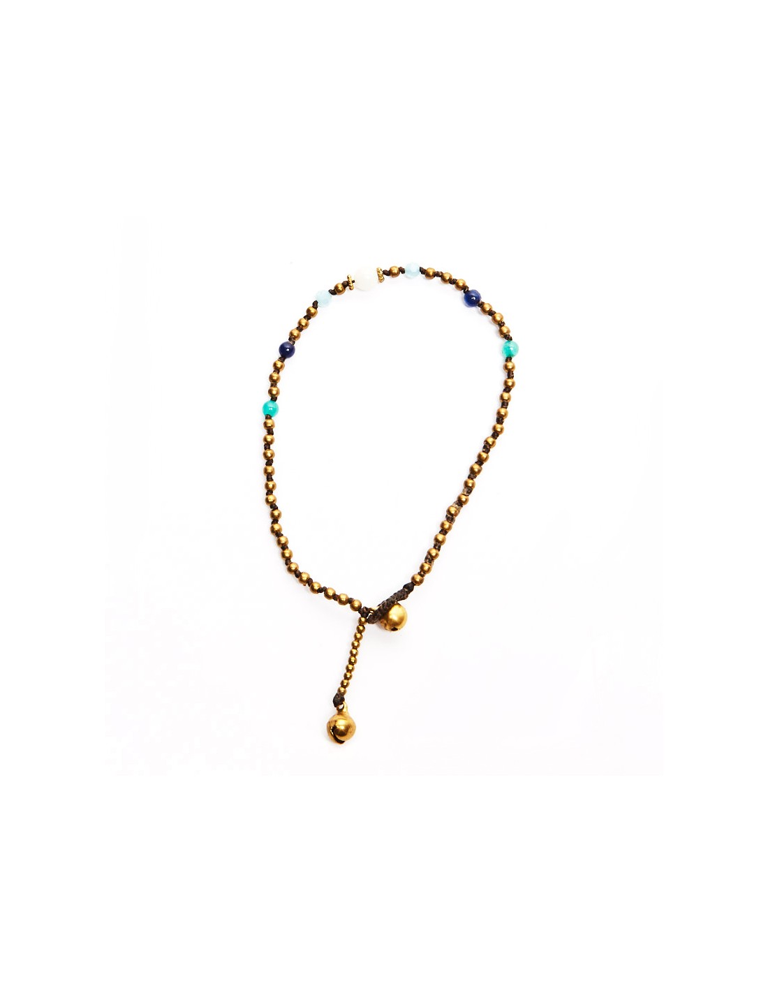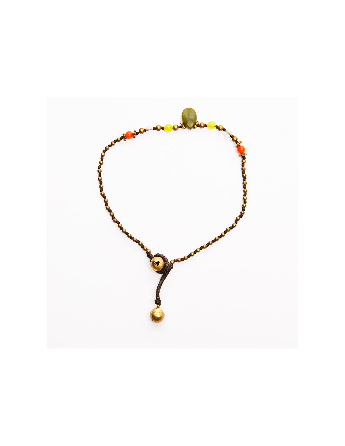 Tobillera de hilo acerado de bolitas de bronce combinada con piedras , toda anudada .Longitud de 22 cms . Dispone de dos cascabeles como cierre para graduar longitud .Variedad de tonalidades .