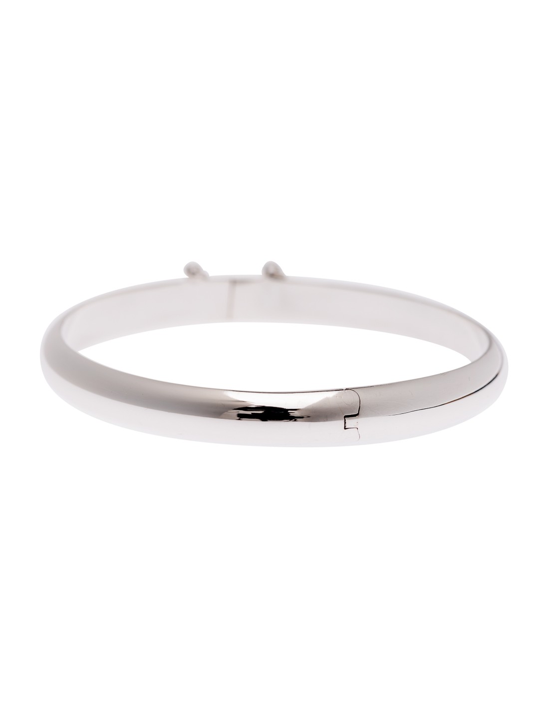 Esclava redonda de plata lisa ,sección de media caña de 7 mm. de ancha. Abertura por bisagra y cierre de pestaña de doble click con cadenita de seguridad .