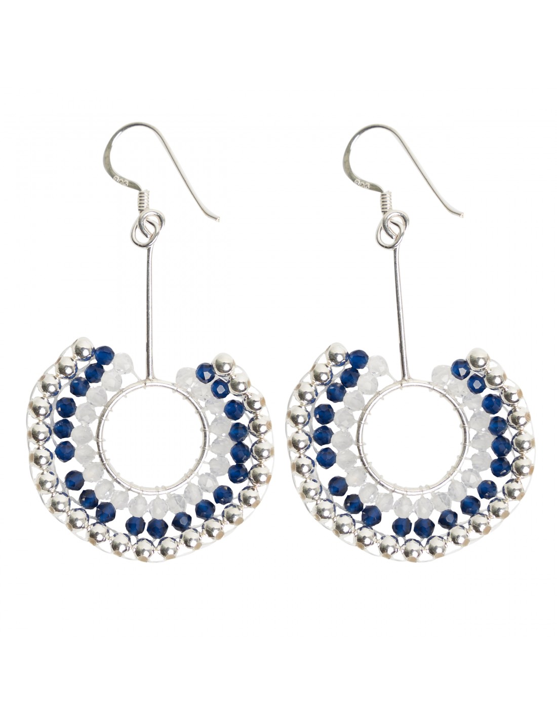 Pendiente largo de plata y shakira combinada azuly blanca.Cierre de gancho.