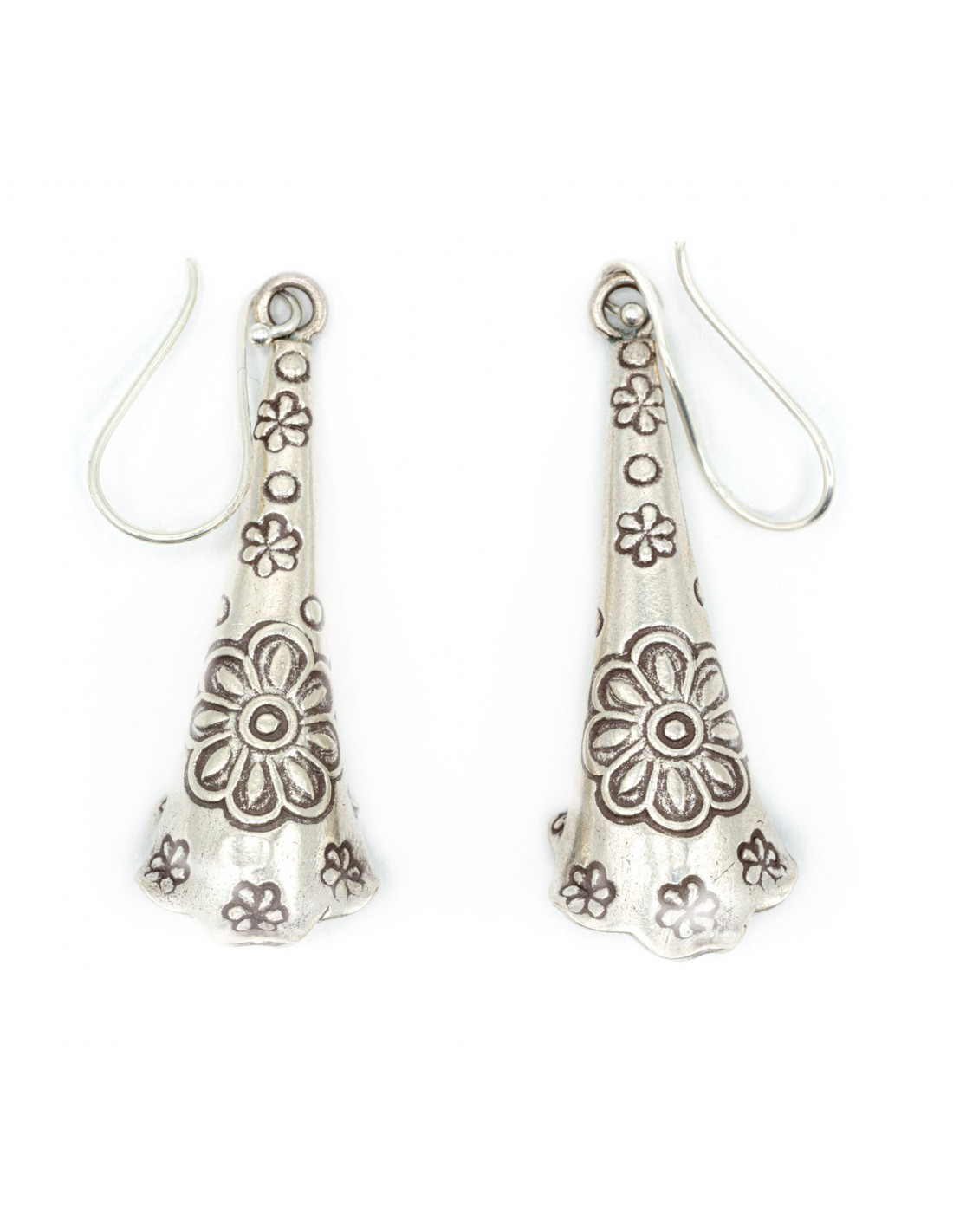 Pendiente Karean de Plata con flores grabadas . Tamaño de 38x12mm. Cierre de gancho.