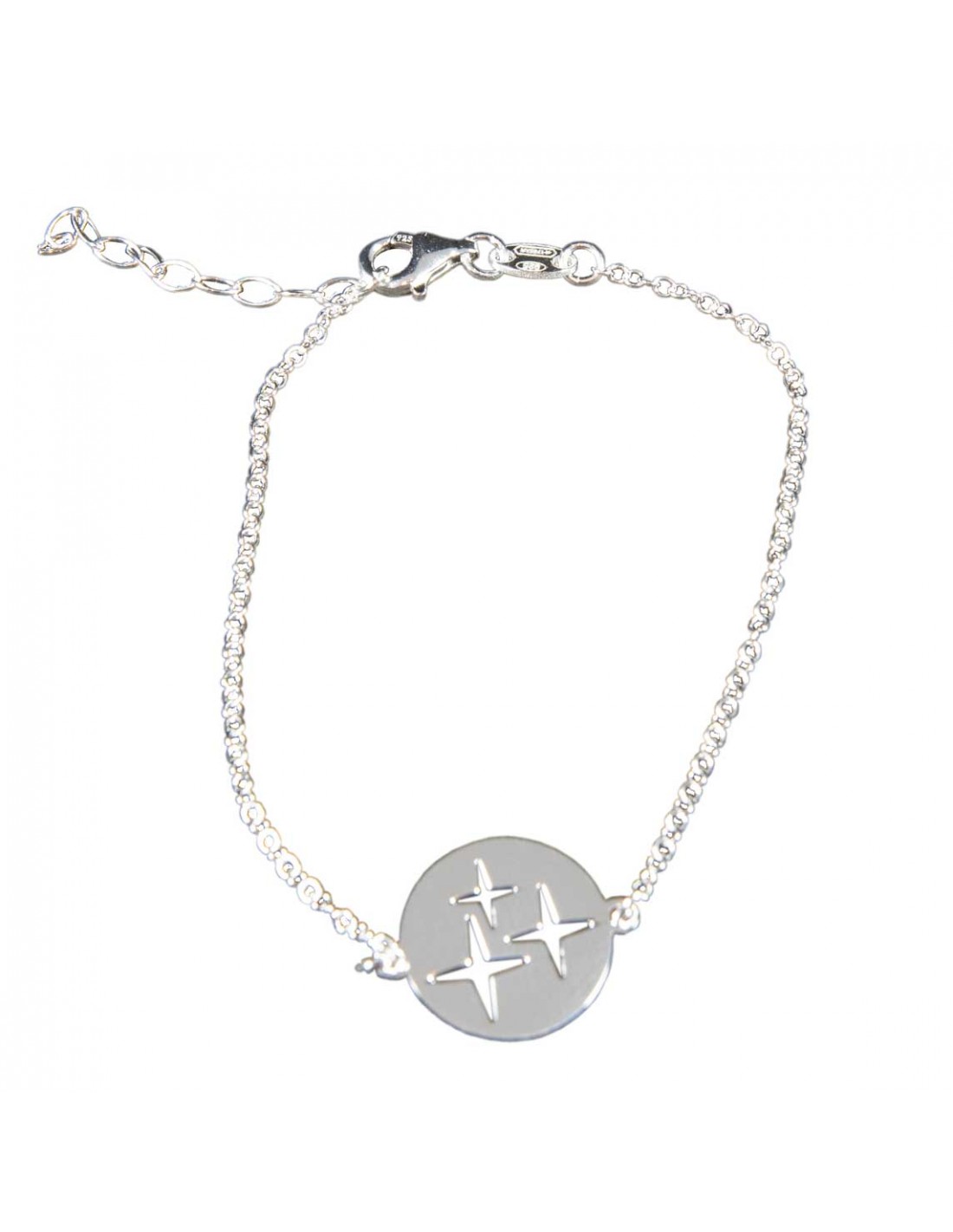 Pulsera de Plata rodiada compuesta de círculo central intercalado con tres estrellas caladas . Longitud de 16+2cms. Cierre de mosquetón.
