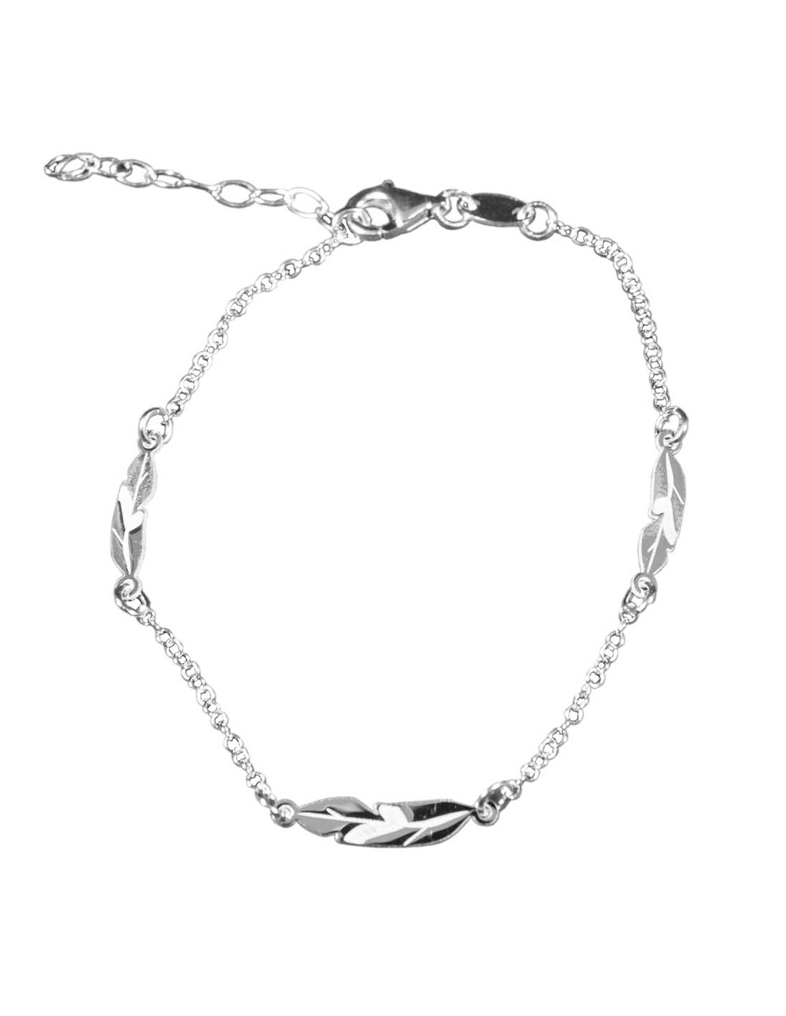 Pulsera de Plata rodiada con tres plumas intercaladas . Longitud de 16+2cms. Cierre de mosquetón.
