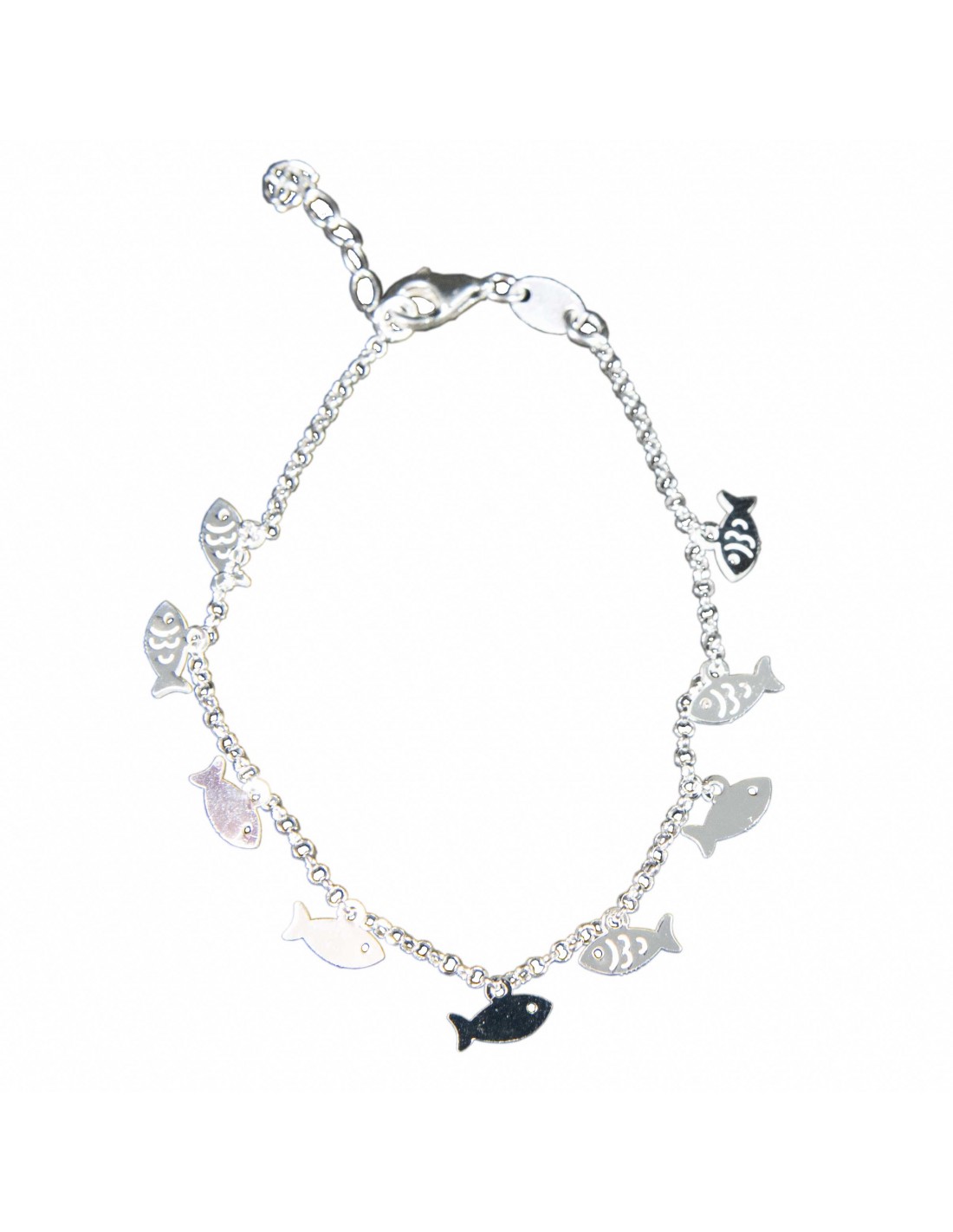 Pulsera con peces colgantes de Plata rodiada . Tamaño de 16+2cms. Cierre de mosquetón.