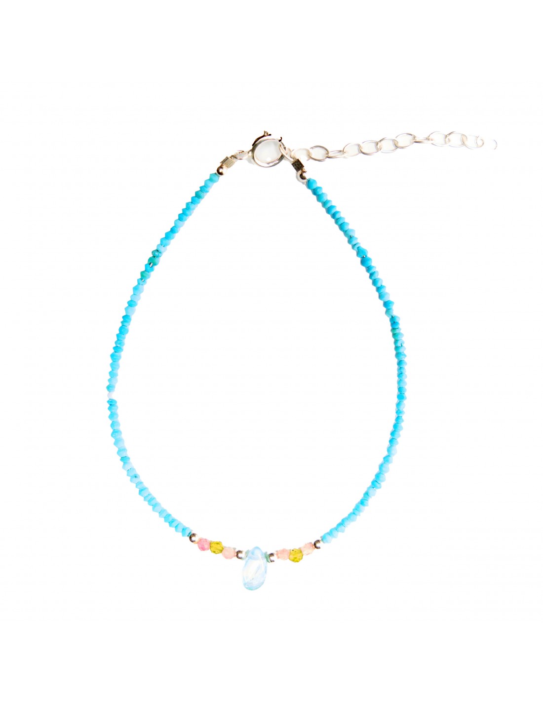Recién llegado Tobillera de Turquesa y Agua Marina. 890193 Tobillera de Turquesa Nepali combinada con Rubis Y olivina y Agua Marina como motivo central mas 5cms. de cadenita de Plata . Cierre de reasa . Ver