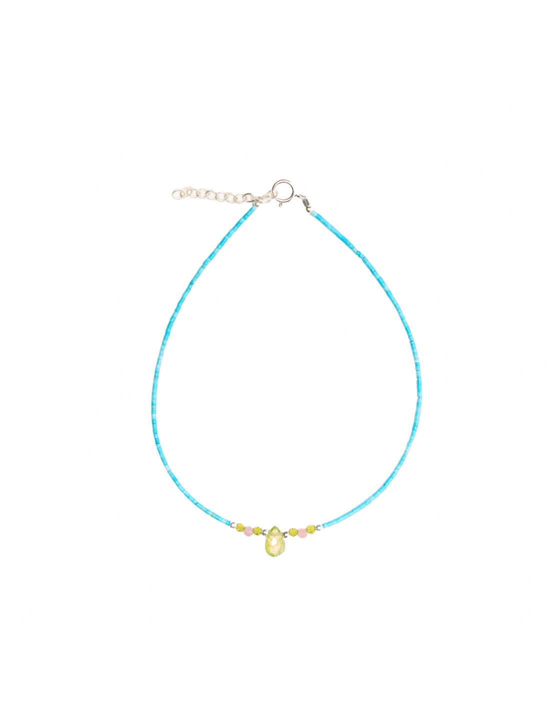 Tobillera de Turquesa cominada con quarzo rosa yPeridot y Peridot como piedra central.